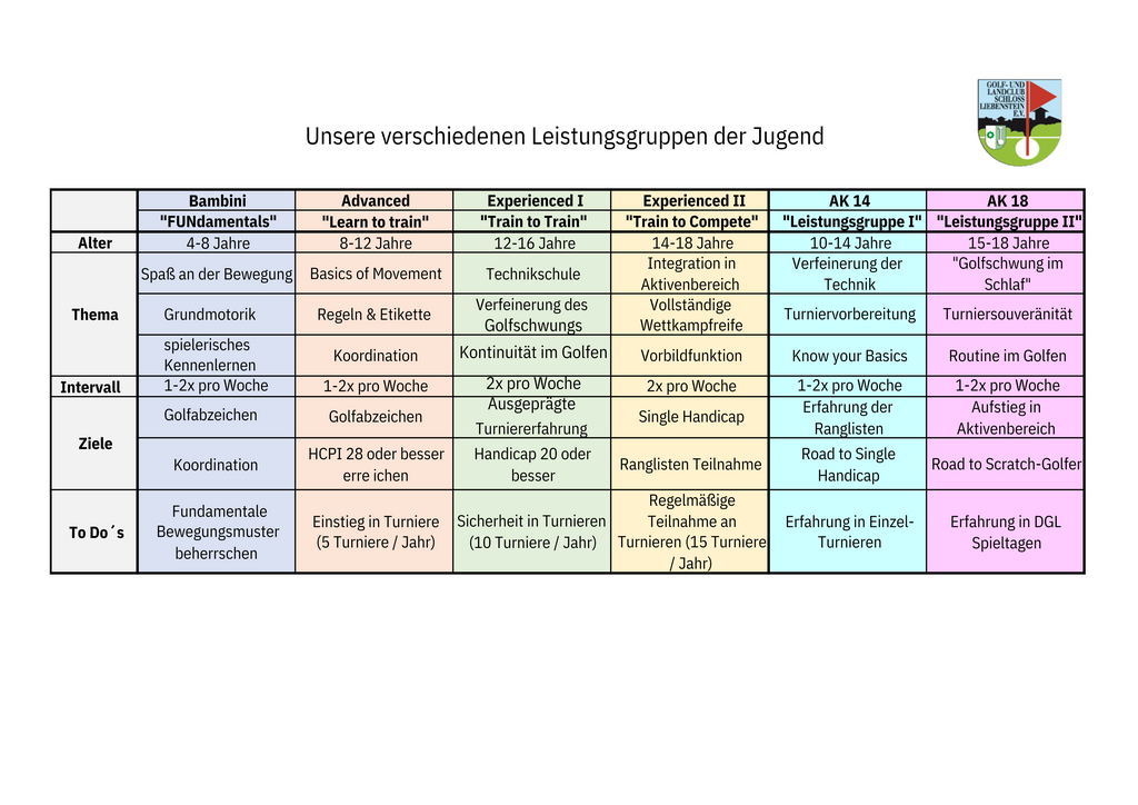 Der Verein sowie der Förderverein unterstützen Kinder und Jugendliche auf ihrem Weg zu einem erfolgreichen Golfspiel. Dabei ist es egal, ob leistungsorientiert oder nicht. Im Vordergrund stehen Spaß, Teamgefühl, Disziplin und persönliche sowie körperliche / mentale Entwicklung.